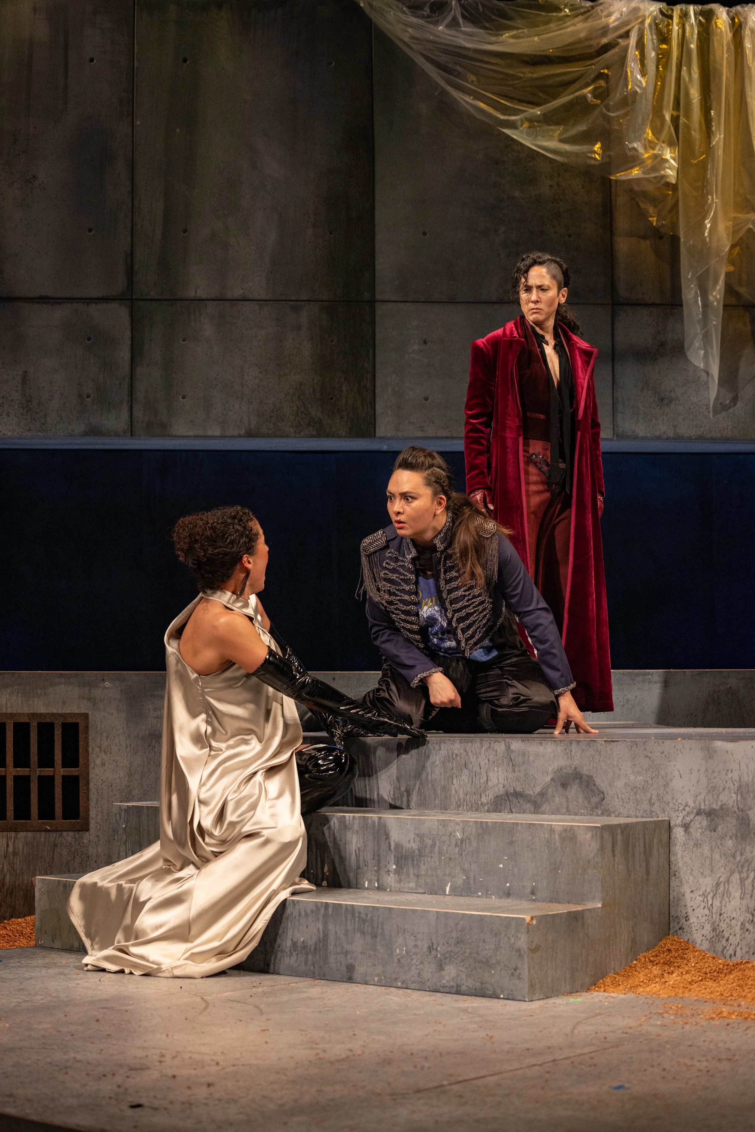 [Alina Collins Maldonado as Olivia, Lilli Hokama as Viola/Cesario, and Alyssa Keegan as Orsino in Folger Theatre's production of William Shakespeare’s ‘Twelfth Night.’ Photo by Erika Nizborski.]