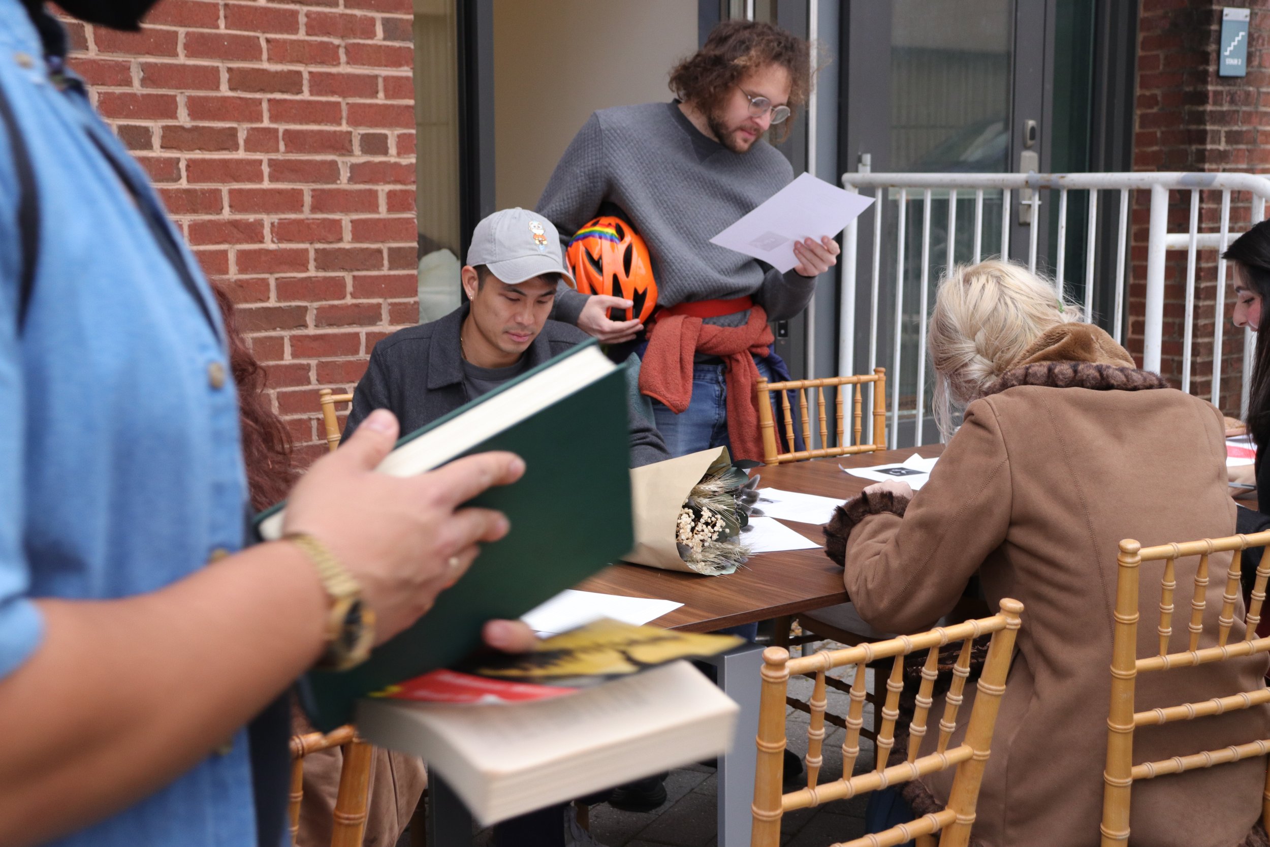 [Photo of people reading at a table at the Bol Launch Party. Photo by Mohammed Shahrukh, @mohammedshahrukh]